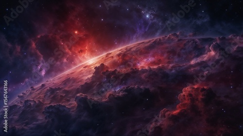 Deep space background with dark galaxy clouds and glowing nebula lights in red and purple tones, highly detailed, 4k sci-fi look"