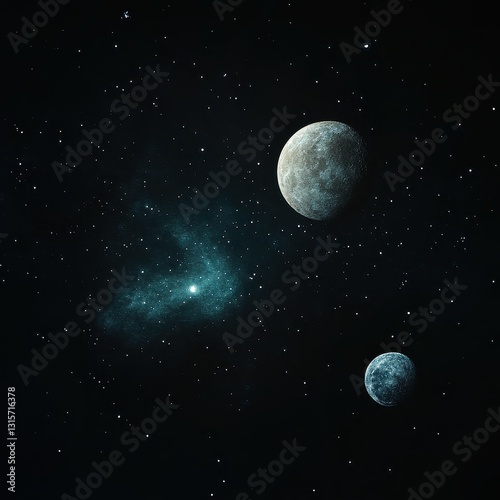 Deep space fantasy, celestial moons with intricate crater designs, soft radiant glow, ultra-realistic night sky filled with constellations.