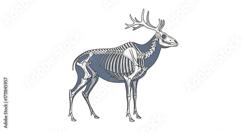Deer Skeleton: A detailed, scientific illustration reveals the intricate skeletal structure of a deer, showcasing its anatomy and bone composition for educational and artistic purposes.