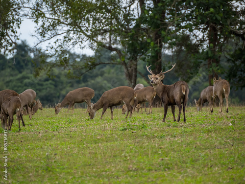 Deer with beautiful horns stands next to a female deer. In the Phu Khiao Wildlife Sanctuary, Thailand