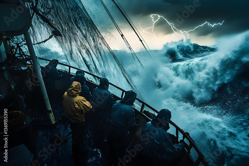 boat, ocean, wave, resilience, courage, sea, sky, dark, ominous, vessel, clothing, wind, rain, lightning, stern, determined, marin, nautical, seafaring, rough sea, weather, dramatic, maritime, fishing, ocean life, chaos, danger, adventurous, ocean view, horizon, survival, open sea, element