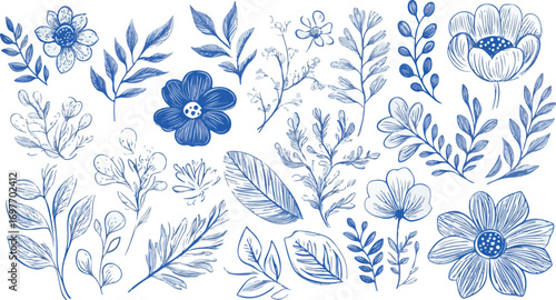Delicate blue watercolor floral elements and botanical illustrations on a white background