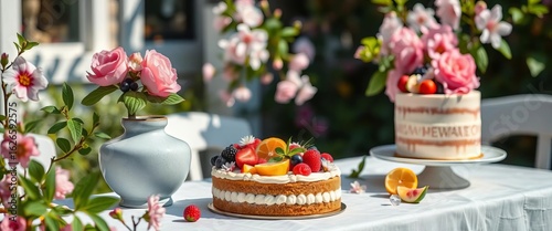 Delicate cakes, vibrant fruit & blossoms adorn a sun-drenched garden table, cakes, pastries