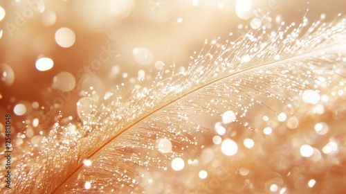 Delicate feather covered in glistening water droplets, against a background of soft, warm light bokeh and golden tones. Abstract, elegant, and