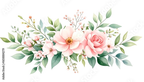 floral, arrangement, bouquet, rose, pink, pastel, delicate, soft, leaf, greenery, sprig, blossom, flower, romantic, elegant, spring, summer, beautiful, pretty, watercolor, illustration, design, art, vintage, nature, botanical, graphic, composition, softness