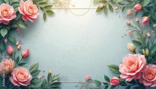 Delicate floral border with pink roses and green leaves creates a beautiful frame for text or images. Gentle pastel background with elegant gold accent line.