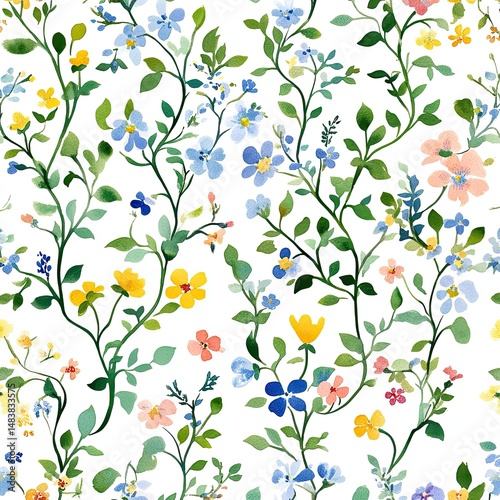 floral, pattern, seamless, climbing, vine, flower, pastel, colours, delicate, airy, white, background, botanical, spring, summer, design, illustration, texture, repeat, small, tiny, yellow, blue, pink, green, leaf, bud, vibrant, decorative, elegant, pretty, charming, romantic, vintage, artistic, patterned, subtile, soft, whimsical, organic, natural, trendy, modern, classic, nature