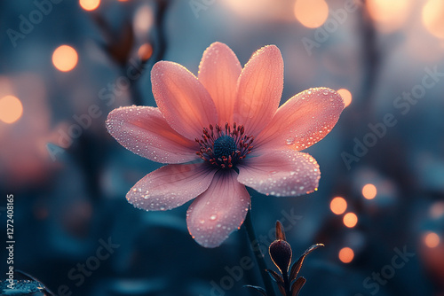 Delicate flower adorned with morning dew, bathed in gentle light
