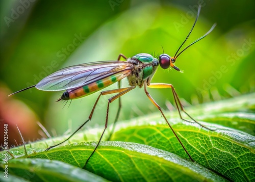 Delicate fungus gnat perches on a leaf's edge, its long slender body and transparent wings a striking contrast to the lush green plant surroundings.