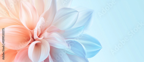 Delicate pastel dahlia flower with softly layered petals blending into a serene blue and peach gradient background