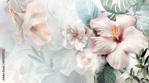 Delicate pastel hibiscus flowers and soft green leaves create a dreamy floral background illustration
