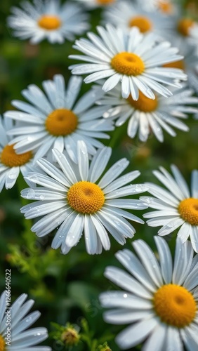 Delicate petals of daisy flowers glisten with morning dew, blooming, dew drops, nature