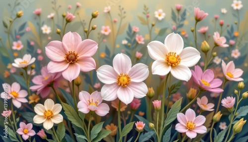 Delicate Pink and White Dahlias Blooming in a Summer Meadow Peaceful floral scene
