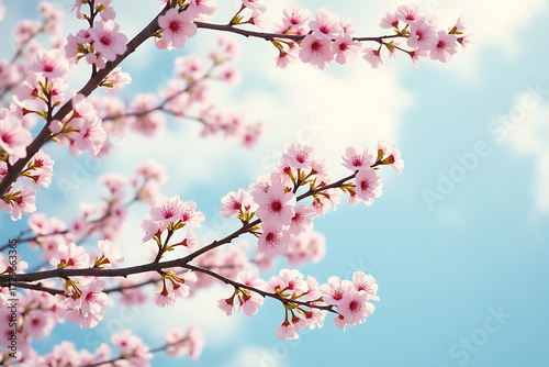 Delicate pink cherry blossoms against a soft blue sky