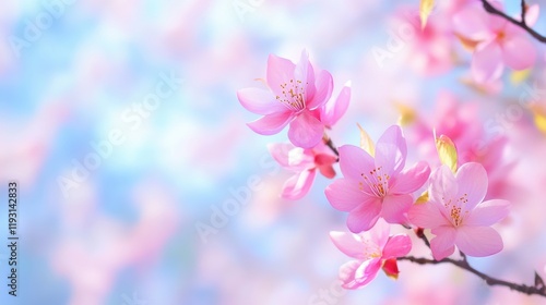 Delicate pink cherry blossoms bloom against a soft blue background, capturing the essence of spring's beauty