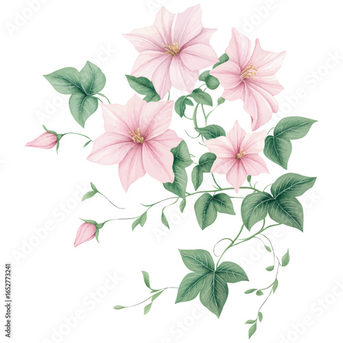 clematis, flower, pink, vine, botanical, leaf, green, bloom, floral, nature, soft, elegant, flower petals, garden, plant, romantic, pastel, illustration, flora, spring, climbing, natural, delicate, drawing, graceful, floral arrangement, garden flower