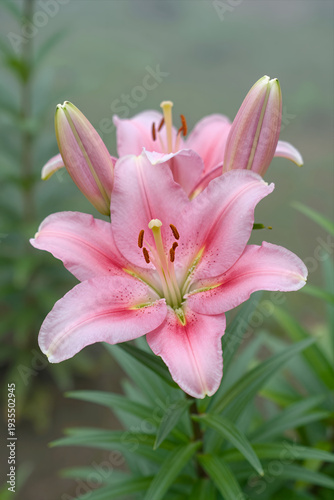Delicate Pink Lily Flower in Bloom with Soft Petals and Green Foliage Natural Garden Background Closeup Floral Photography