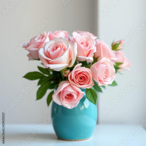 Delicate pink rose bouquet in a turquoise ceramic vase, vase, flowers, floral arrangement