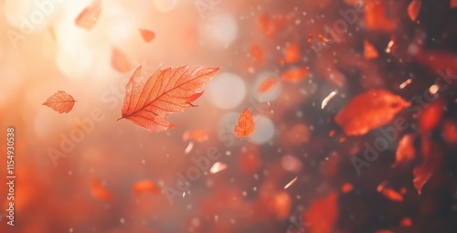 Delicate Red Leaves Floating in the Air with Glowing Background and Subtle Bokeh Creating an Enchanting Autumn Atmosphere for Fall Season