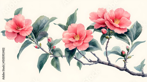 flower, watercolor, illustration, tree branch, camelia, pink flower, nature, botanical, flower petals, leaf, delicate, artistic, blossom, spring, vibrant, flora, natural beauty, plant, closeup, greenery, detailed, floral pattern, tranquil, aesthetic, blooming, floral arrangement, fine art, elegant, peaceful, seasonal, garden, colorful flowers, garden design