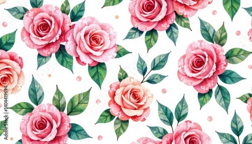 Delicate watercolor roses & leaves, repeating pattern, pink, repeat, illustration