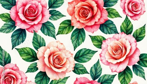 Delicate watercolor roses, lush green leaves, seamless repeat , art, bloom