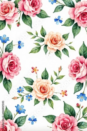 Delicate watercolor vintage roses & forget-me-nots, seamlessly repeating , spring, seamless pattern, white