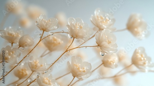 Delicate white flowers with water droplets, soft focus on a light background