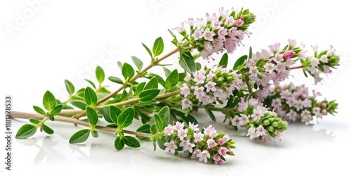 Delicate wild thyme flowers bloom, isolated on white, showcasing their herbal beauty in botanical detail.