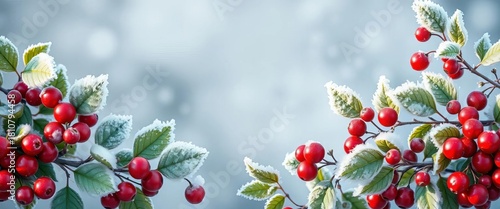 Delicate winter floral frame with frosted leaves and berries, icy background, design, crystal
