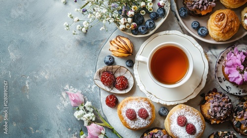 tea, cup, dessert, sweet, pastry, flower, blueberry, raspberry, cream, donut, biscuit, table, food, delicious, tasty, relaxation, cafes, afternoon, break, celebration, elegant, treat, arrangement, overhead, cookery, cosy, snack, fruit, circular, floral, lifestyle, tradition, summer, joy, epicure, harmony, aesthetic, serving, vibrant, colours, feast, inviting, casual attire