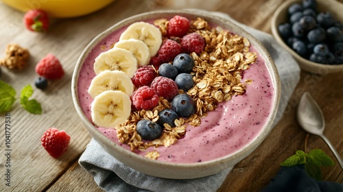 Delicious and Healthy Smoothie Bowl with Berries, Banana and Granola