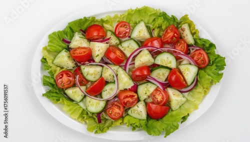 Delicious and nutritious veggie mix served on a white dish with fresh tomatoes, cucumbers, onions, and leafy greens.