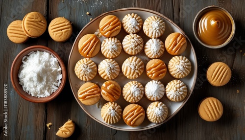 Delicious Argentina Alfajores on Plate with Coconut and Caramel Sauce in Bowl Displayed
