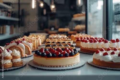 Delicious Array of Assorted Cakes and Pastries Displayed in a Bakery Window During the Day