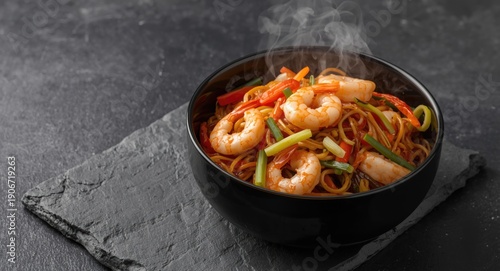 Delicious Asian style prawn noodle stir fry with vegetables in black bowl placed on dark stone background with copy space