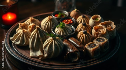 dumpling, assorted, platter, food, cookery, dinner, asian, savoury, meat, herb, appetiser, epicure, hand-made, wood, delicious, elegant, eatery, dining, meal, culinary, traditional, snack, creativity, favor, preparation, sharing, warmth, black, lemony, spicey, colourful, dark, table, feasting, noodle, ingredient, gourmet food, waxy, presentation, delightful, rich, taste, cultural