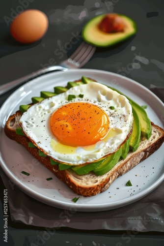 Delicious avocado toast topped with a perfectly fried egg on whole grain bread with seasoning in a cozy kitchen setting