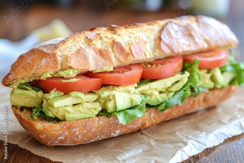 Delicious baguette sandwich with avocado, tomato, and lettuce filling on brown paper