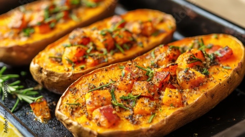Delicious baked sweet potatoes with rosemary and seasoned cubes for gourmet meal