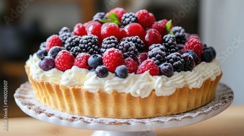 Delicious berry tart with cream and fresh fruit arranged on a decorative plate creating an inviting dessert presentation.