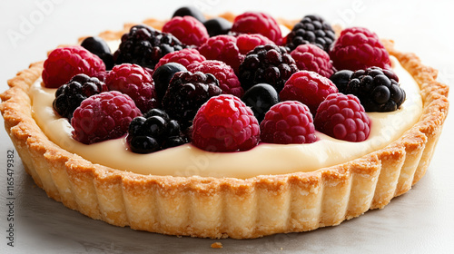 Delicious berry tart with creamy filling and fresh raspberries, blackberries