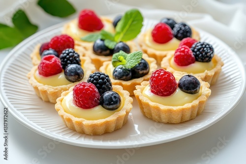 dessert, pastry, tart, berry, raspberry, blackberry, blueberry, fruit, sweet, yellow, cream, vanilla, pastry, baked, plate, white, fresh, ripe, food, delicious, close, up, detail, texture, round, edge, gold, crust, creamy, filling, garnish, mint, leaf, edible, arrangement, buffet, catering, celebration, treat, elegant, aesthetic, background, tabletop, light, surface, macro