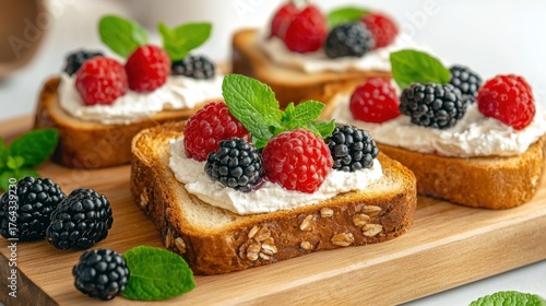 toast, berry, raspberry, blackberry, cream cheese, mint, breakfast, snack, dessert, healthy, wood, presentation, fresh, food, epicure, sweet, colourful, natural, table, receipe, homemade, vibrant, summer, meal, arrangement, rustic, ingredient, vegetarian, appetising, treat, cookery, culinary, dining, plate, clean, tasty, organic, seasonal, simplicity, wholesome, platter, bite, delightful, enjoyment, indulgence, nourishment, bright