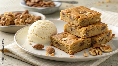 Delicious blondies with chopped nuts served with a scoop of vanilla ice cream on a white plate