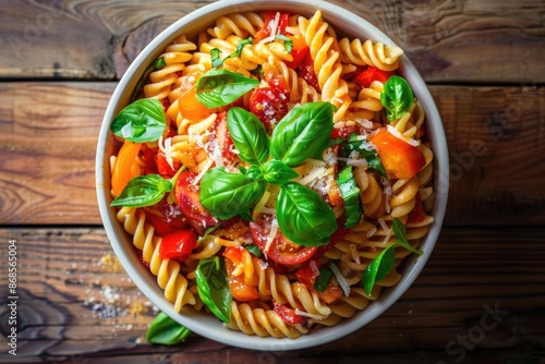 Delicious bowl of fusilli pasta with fresh basil, ripe tomatoes, and creamy cheese, served on a rustic wooden table.