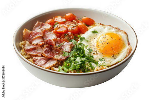 Delicious breakfast bowl featuring bacon, cherry tomatoes, green onions, and a fried egg in a white bowl isolated on transparent background