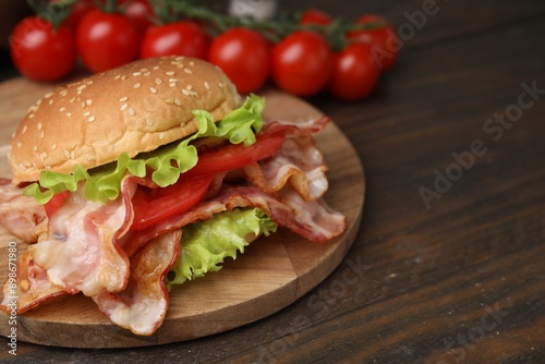 Delicious burger with bacon, tomato and lettuce on wooden table, space for text