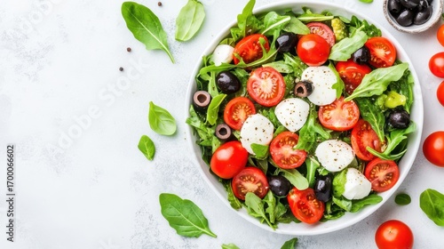 salad, tomatoes, mozzarella, olive, basil, healthy eating, food photography, vegetarian, italian cuisine, healthy lifestyle, arugula, green leaf, white bowl, light meal, diet food, rustic, homemade, organic food, health food, cherry tomato, black olive, white background, topview, vivid colors, alimentary, lunch, dinner, side dish, closeup, food and drink, lifestyle, culinary, freshness, table setting