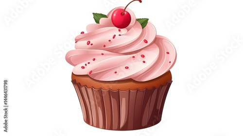 Delicious Chocolate Cupcake with Pink Cream and Cherry on White Background for Bakery Blog or Menu Design